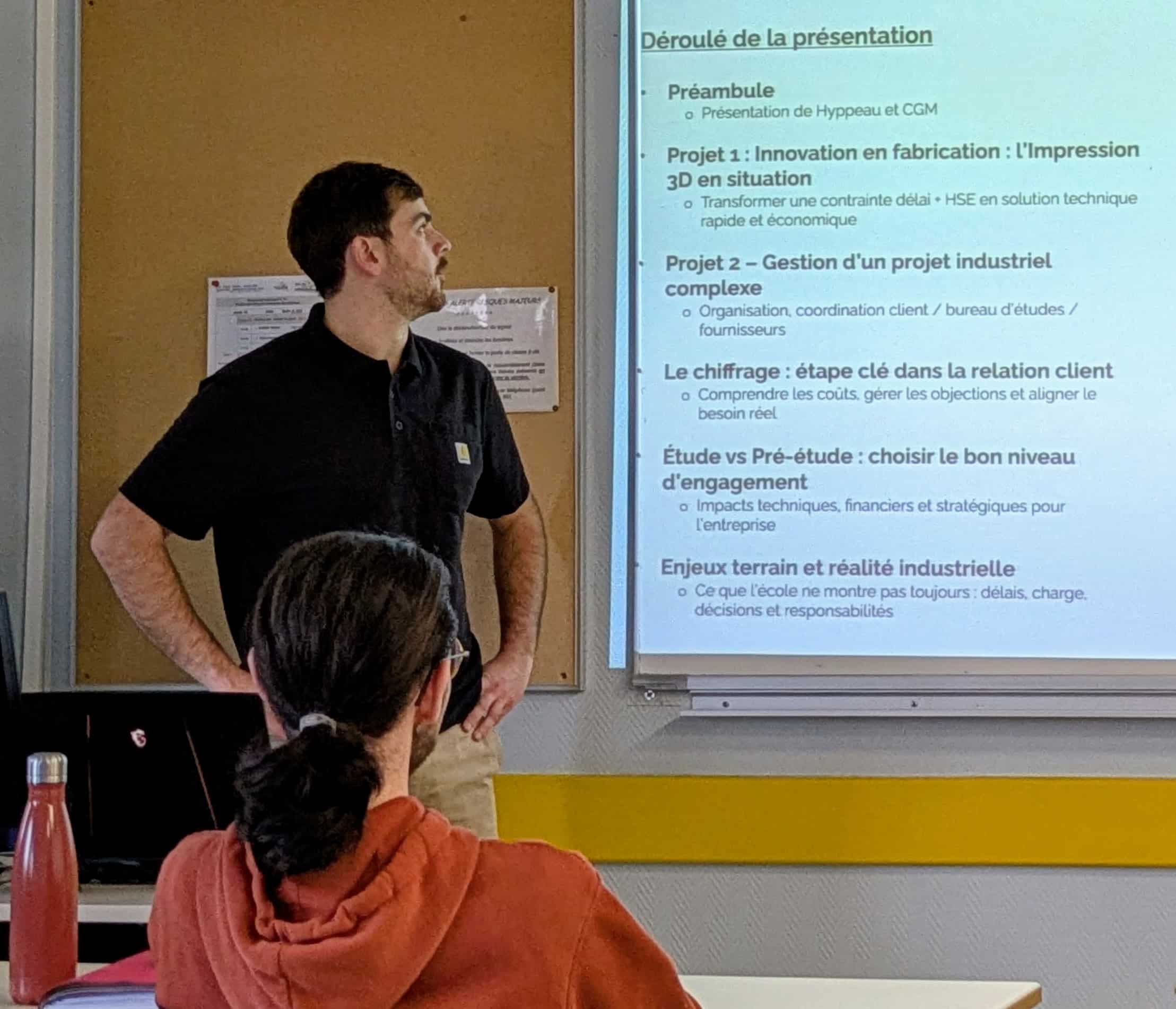 Mercredi 10 décembre 2025, Renaud Hyppeau et Romain Vidal, deux mentors, ont présenté la gestion d’un projet industriel aux étudiants de Première année du BTS Conception de produits industriels.